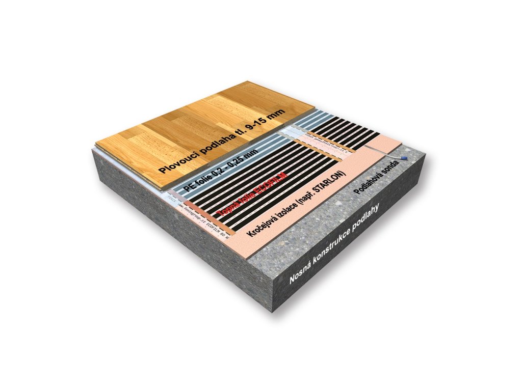 Podlahové fólie ECOFILM F (40/60/80 W / m²) ponúkame v šírke 60 a 100cm. Vďaka minimálnej hrúbke 0,4mm je fóliu možné pokladať priamo pod plávajúcu podlahu. V súlade s predpismi je nutné prekryť vykurovacie fólie druhou vrstvou PE fólie s hrúbkou min. 0,2mm (plní funkciu druhej elektroizolácie) a tým konštrukčne vytvorí spotrebič triedy II.
